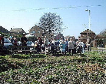 The first picture & the one above show villagers congregating at the beginning of the ceremony to mark the purchase of Vicarage Meadow from the church by the Parish Council |